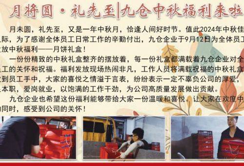 月未圆,礼先至,又是一年中秋月,恰逢人间好时节。值此2024年中秋佳节之际,为了感谢全体员工日常工作的辛勤付出,九仓企业于9月12日为全体员工发放中秋福利--月饼礼盒!